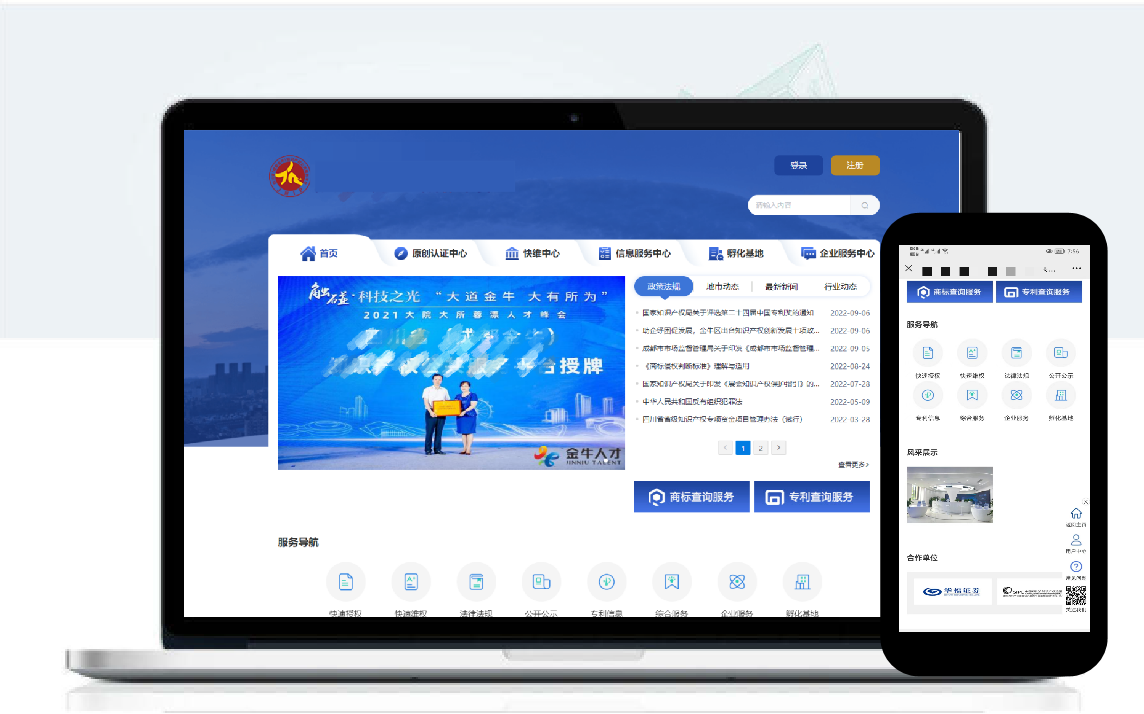 支持移動(dòng)端和PC端兼容性適配,提供首頁(yè)、原創(chuàng)認(rèn)證中心、信息服務(wù)中心、企業(yè)服務(wù)中心、孵化基地等服務(wù)模塊。