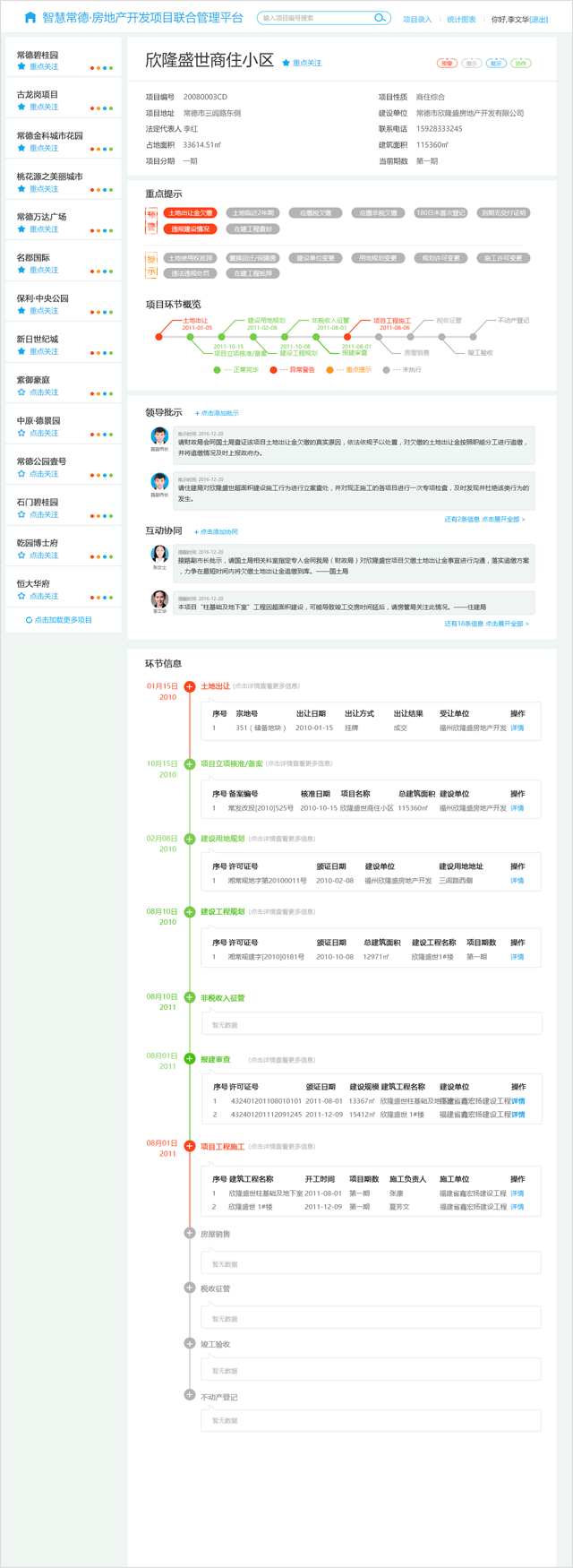 項目詳情將一個房地產(chǎn)項目的基本信息、開發(fā)環(huán)節(jié)、預警提示、領導批示以及互動協(xié)助,以及各環(huán)節(jié)中信息進行綜合整合和管理。